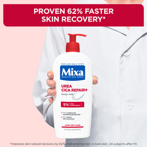Description: Mixa Urea Cica Repair+ Body Lotion is designed for dry and rough skin, including skin prone to keratosis pilaris, a common condition that appears as small rough bumps or “chicken skin,” often with redness or uneven texture. It helps smooth, hydrate and renew the skin while providing instant comfort and lasting relief. The hypoallergenic formula is non-greasy, non-sticky and absorbs quickly, making it suitable for sensitive skin and daily use. Enriched with 5% urea to smooth and reduce roughness, and panthenol to soothe the skin, it helps visibly improve skin texture and supports faster skin recovery, leaving skin feeling softer, smoother and protected for up to 48 hours.